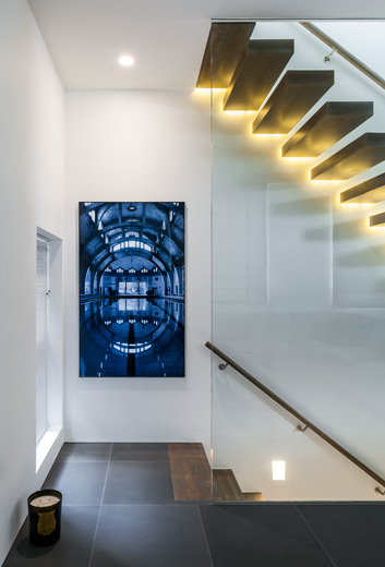 This 4 storey mews house was completely stripped back to the bare brick external walls, and reconfigured to create a 2 bedroom house with open plan living accommodation. A back-lit cantilevered staircase runs between each floor.